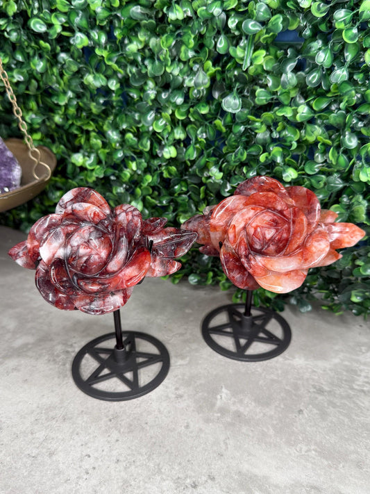 Fire Quartz Peony Flower Crystal Carvings with black stands