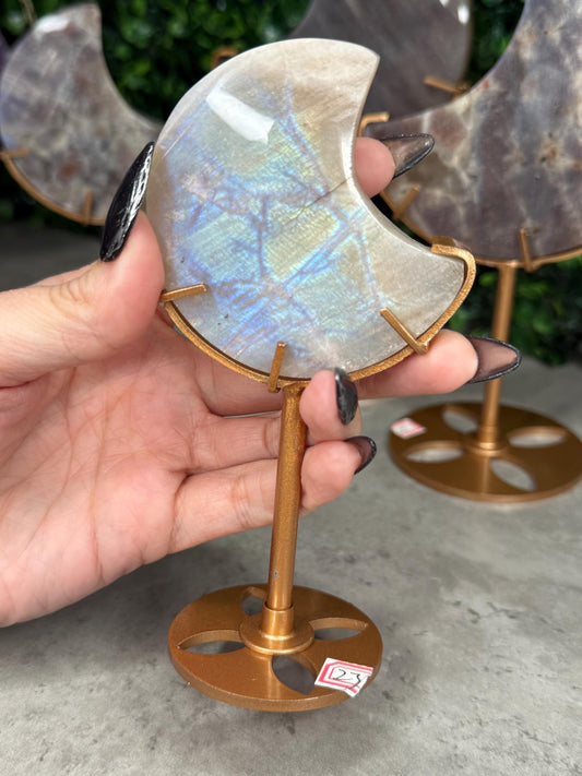 Moonstone and Sunstone Crystal Moon Carvings on Gold Stands